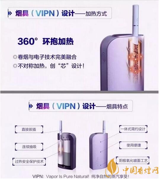 看到海報(bào)圖片上面介紹說,煙具VIPN為360度環(huán)抱加熱,具有直接拔插、連續(xù)抽吸、過熱安全保護(hù)技術(shù)等特點(diǎn)。