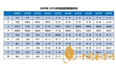 到2018年,「中華」銷量穩(wěn)定在135萬箱以上,市場份額保持在42%以上,「利群」以35萬箱銷量位居第2位,「黃鶴樓」接近25萬箱,「芙蓉王」、「南京」和「鉆石」突破10萬箱。和2009年相比,10萬箱以上品牌從3個增加到7個,5萬箱以上從1個增加到7個,萬箱以上品牌達(dá)到11個,市場的成長性與品牌的爆發(fā)力形成了線性的相得益彰。