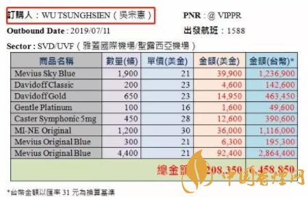 除此之外,黃國昌還貼出一張“訂購單”圖片,其中顯示“訂購”內容為八種香煙,金額總計6458850元新臺幣,還標注了航班、日期、機場等信息,而“訂購人”一欄還清楚寫著“吳宗憲”的大名。