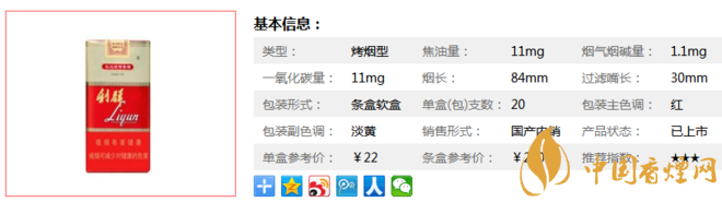 | 類型 :烤煙型 | 焦油量 :11mg | 煙氣煙堿量 :1.1mg | 一氧化碳量 :11mg |