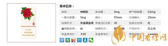 | 類型 :烤煙型 | 焦油量 :6mg | 煙氣煙堿量 :0.6mg | 一氧化碳量 :5mg |