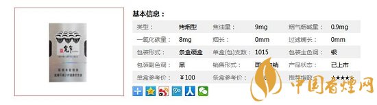 | 類(lèi)型 :烤煙型 | 焦油量 :9mg | 煙氣煙堿量 :0.9mg | 一氧化碳量 :8mg |