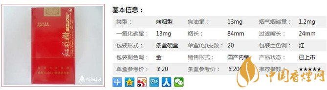 | 煙長(zhǎng):84mm | 過(guò)濾嘴長(zhǎng):24mm | 包裝形式:條盒硬盒 | 單盒(包)支數(shù):20 |