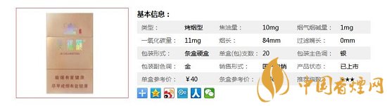 | 類型 :烤煙型 | 焦油量 :11mg | 煙氣煙堿量 :1.2mg | 一氧化碳量 :11mg |