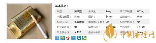 | 類型 :烤煙型 | 焦油量 :7mg | 煙氣煙堿量 :0.7mg | 一氧化碳量 :8mg |