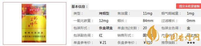 | 類型 :烤煙型 | 焦油量 :11mg | 煙氣煙堿量 :1mg | 一氧化碳量 :12mg |