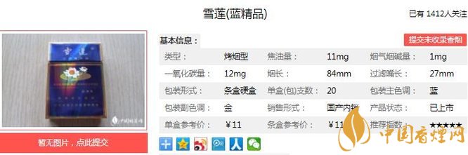 雪蓮藍(lán)精品煙支長(zhǎng)84mm,過濾嘴長(zhǎng)27mm,優(yōu)選國(guó)內(nèi)優(yōu)質(zhì)煙葉,應(yīng)用高分子合成技術(shù)等多項(xiàng)現(xiàn)代工藝技術(shù)精制而成;香氣自然、高雅,余味醇厚、干凈舒適。下面我們一起來(lái)看雪蓮藍(lán)精品的參數(shù)信息:焦油量:11mg 煙堿量:1.0mg 一氧化碳量:12mg