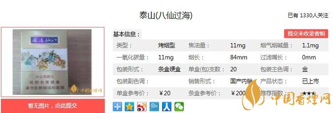 泰山八仙過??诟泻臀兜缹賹嵧玫?,有股濃郁茶甜香的味道。加上煙盒與煙支的包裝設計,也有著自己的個性,算得上是一款性價比比較高的香煙,值得一抽。經香煙網小編市場調查泰山八仙過海售價為20元/包。