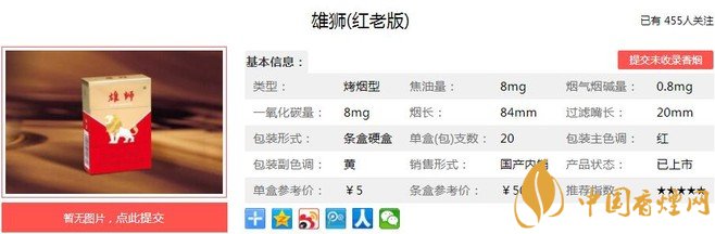 以上便是由香煙網(wǎng)小編為大家介紹的關(guān)于雄獅紅老版口感及參數(shù) 5元檔卷煙的領(lǐng)跑者的相關(guān)信息,想要了解更多有關(guān)內(nèi)容請(qǐng)點(diǎn)擊: 紅金龍硬曉樓價(jià)格及參數(shù) 紅金龍硬曉樓口感分析