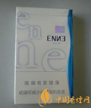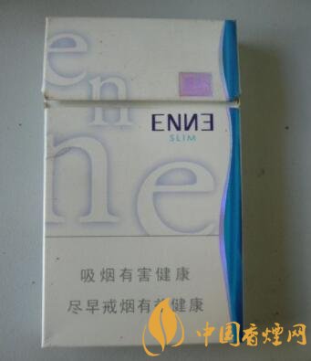 包裝采用瓷白色的干凈背景,配以藍(lán)色的E和N兩個英文字母的組合疊加運用,從上至下,從左至右,個性鮮明,最下面寫著吸煙有害健康盡早戒煙有益健康的警示語標(biāo)志,右邊是一束成s形的藍(lán)色圖塊,整體包裝簡約明快、時尚大氣。