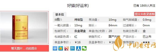 好貓好運(yùn)來(lái)煙支長(zhǎng)84mm,采用優(yōu)質(zhì)有機(jī)原料、特色天然香料、獨(dú)有生物技術(shù)、特色工藝技術(shù)精心打造的一款高附加值產(chǎn)品。下面我們一起來(lái)看好貓好運(yùn)來(lái)的參數(shù)信息:焦油量:10mg 煙堿量:0.9mg 一氧化碳量:10mg