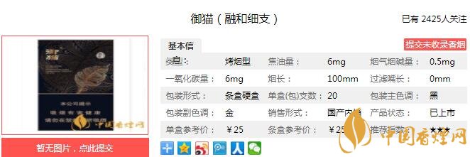 御貓融和細支煙支長100mm,過濾嘴長35mm,金色的御貓,以及具有藝術感的,變形的融和字樣,印制于過濾嘴紙張之上,煙絲色澤金黃。下面我們一起來看御貓融和細支的參數(shù)信息:焦油量:6mg 煙堿量:0.5mg 一氧化碳量:6mg