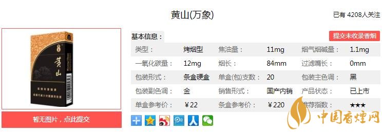 黃山萬象煙支長84mm,過濾嘴長35mm,煙嘴是金色,配的黑色的圓圈做點綴,煙支的顏色為咖啡色。下面我們一起來看黃山萬象的參數(shù)信息:焦油量:11mg 煙堿量:1.1mg 一氧化碳量:12mg
