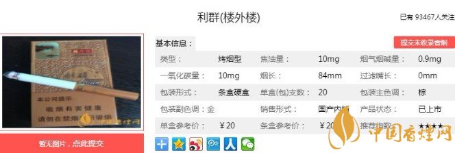 以上便是香煙網(wǎng)小編為大家介紹的關(guān)于利群樓外樓多少錢一包 利群樓外樓價格及口感分析的相關(guān)信息,看完之后大家是不是對于利群(樓外樓)這款香煙的相關(guān)信息更加了解呢。大家還想查詢更多的相關(guān)內(nèi)容歡迎點擊:利群休閑系第一款細(xì)支高價煙,僅僅是官方報價就達(dá)到了100元一包!