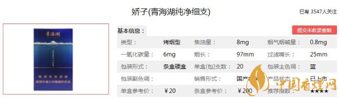 以上便是香煙網(wǎng)小編為大家介紹的關(guān)于嬌子青海湖純凈多少錢(qián)一包 青海湖純凈價(jià)格及圖片介紹的相關(guān)信息,看完之后大家是不是對(duì)于嬌子(青海湖純凈)這款香煙的相關(guān)信息更加了解呢。大家還想查詢更多的相關(guān)內(nèi)容歡迎點(diǎn)擊:嬌子青海湖細(xì)支香煙多少錢(qián)一包 嬌子青海湖細(xì)支參數(shù)