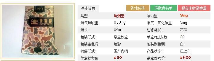 黃鶴樓香煙大彩(硬)綜合應(yīng)用國內(nèi)多產(chǎn)區(qū)煙葉,凸顯立體吸味。在配方技術(shù)上,充分利用增香功能薄片、亮色煙等復(fù)合配方技術(shù),在豐富了產(chǎn)品香韻,降低焦油至6毫克。黃鶴樓大彩的煙支采用了焦油標(biāo)尺刻度,消費(fèi)者可以輕松了解并掌控攝入的焦油含量。采用大漠迷彩紋飾,賦予產(chǎn)品特別的身份象征,與其他產(chǎn)品形成天然的視覺區(qū)隔,帶、一股特別的時尚硬朗氣息。