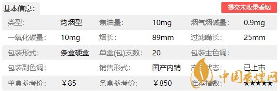 | 類型 :烤煙型 | 焦油量 :10mg | 煙氣煙堿量 :0.9mg | 一氧化碳量 :10mg |