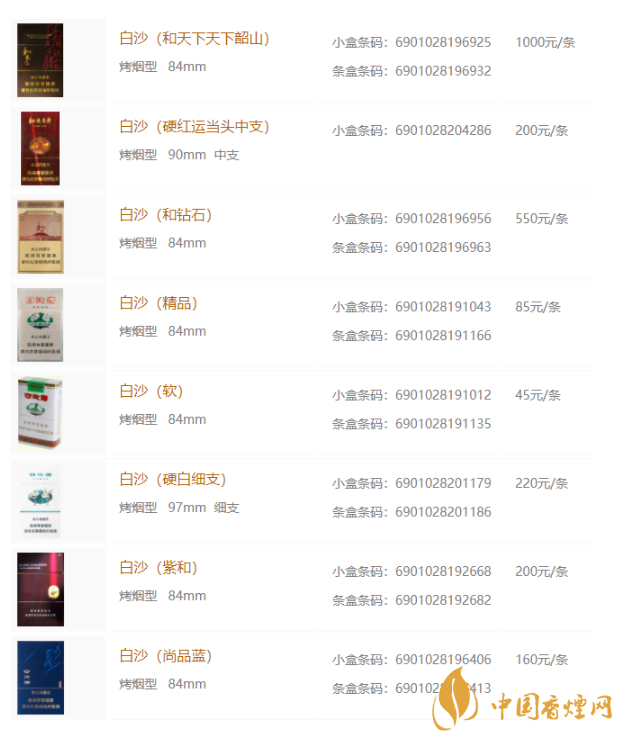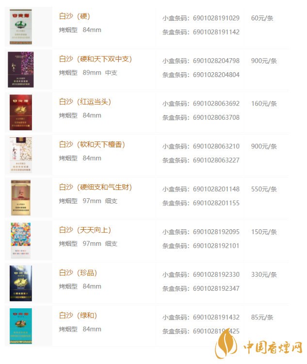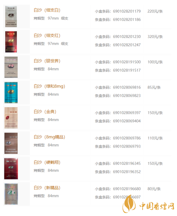 白沙香煙價格表大全