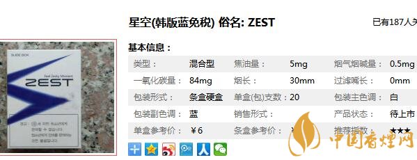 ZEST(星空)是韓國(guó)的香煙品牌,是薄荷口味的香煙,煙氣也不太香,薄荷味比較濃郁,但是包裝非常的小清新,比較適合年輕人,下面在對(duì)星空香煙價(jià)格表分析之前,先來(lái)看一看星空香煙多少錢(qián)一包,星空香煙的價(jià)格在10到15元之間,下面就來(lái)對(duì)這款香煙價(jià)格進(jìn)行一個(gè)具體的分析。