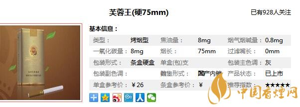 芙蓉王香煙于1994年誕生,參與中國高檔卷煙市場競爭,意在搶奪20元檔以上這一當(dāng)時(shí)的價(jià)位市場空白點(diǎn),然而芙蓉王香煙做的非常成功,它的風(fēng)格深受廣大卷煙消費(fèi)者喜愛,更因其內(nèi)在品質(zhì)被譽(yù)為“中式卷煙的典范代表”。在對(duì)新出短支黃芙蓉王售價(jià)進(jìn)行分析之前,先來看看這款芙蓉王短支多少錢一包,這款香煙叫做芙蓉王(硬75mm)售價(jià)為26元/包。