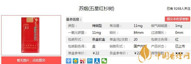 蘇煙五星紅杉樹產(chǎn)品包裝大膽采用全版電化鋁印刷技術(shù)及橫向的純字體裝飾,外觀設計簡約大方、時代感強,喜慶、大方,與“蘇煙”系列產(chǎn)品風格一脈相。經(jīng)香煙網(wǎng)小編市場調(diào)查蘇煙五星紅杉樹售價為22元/包。