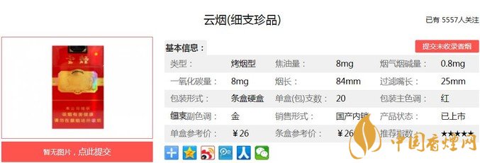 云煙細(xì)支珍品煙支長84mm,過濾嘴長25mm,以滿足消費(fèi)者需求為宗旨,云南中煙堅(jiān)持守正出奇,賦予云煙細(xì)支珍品更趨豐富的吸味、更加愉悅的享受、更富文化感的設(shè)計(jì)。下面我們一起來看云煙細(xì)支珍品的參數(shù)信息:焦油量:8mg 煙堿量:0.8mg 一氧化碳量:8mg