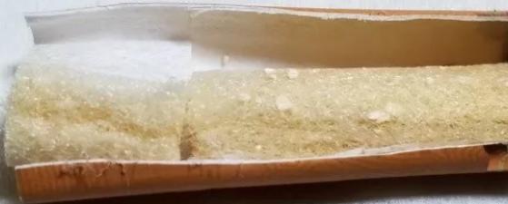 剖開濾嘴...是兩段式濾嘴,前段占據(jù)2/3,絲束里夾雜細碎的白色顆粒,想來是細微甜。濾嘴有降焦孔,基本開在了整個濾嘴的中段位置。從兩段絲束的顏色變化來看,基本均勻,略微變成了淡黃色??磥頍熤У难訜?、空氣的介入等調(diào)節(jié)得都比較理想。香之物。