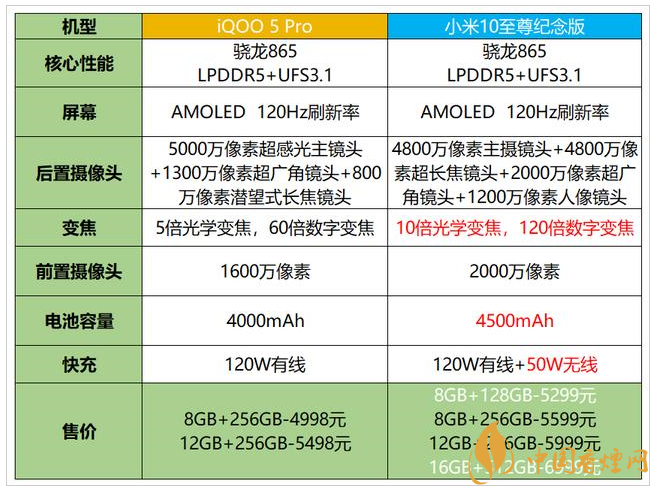 小米10至尊紀(jì)念版的8GB+256GB售價(jià)5599元,12GB+256GB售價(jià)5999元,iQOO5 Pro分別為4998元和5498元,兩個(gè)版本的差價(jià)分別是500元、600元。