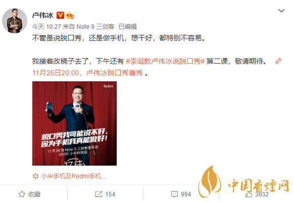 今日,盧偉冰發(fā)微博表示,將會(huì)在Note 9發(fā)布會(huì)上以脫口秀的方式來(lái)聊一聊Redmi和Note系列。