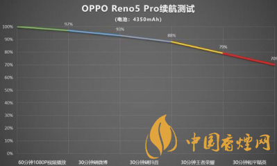 根據(jù)測試結(jié)果顯示,使用OPPO Reno5 Pro觀看60分鐘1080P視頻僅耗電3%、刷30分鐘微博僅耗電4%、刷30分鐘抖音僅耗電5%、玩30分鐘《王者榮耀》僅耗電9%、玩30分鐘《和平精英》僅耗電9%,在高強(qiáng)度使用3小時(shí)后,OPPO Reno5 Pro共計(jì)耗電30%,剩余電量還有70%。