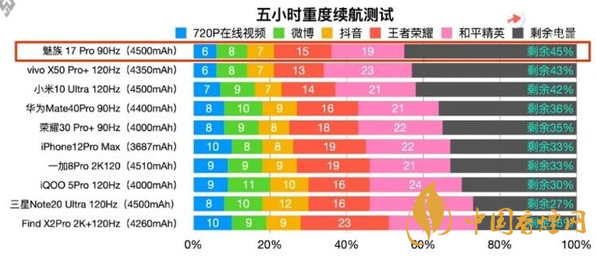 這次測(cè)評(píng)主要通過(guò)對(duì)720P在線視頻、刷微博,抖音,打王者榮耀和平精英等日常應(yīng)用進(jìn)行測(cè)試,得出了5G旗艦的五小時(shí)重度續(xù)航排名。其中,續(xù)航最好的機(jī)型是魅族17 Pro,經(jīng)過(guò)五小時(shí)的重度測(cè)試,該機(jī)還剩下45%的電量。