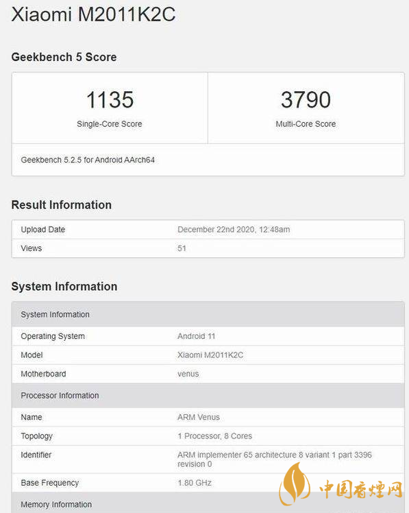 在小米官方宣布完小米11的發(fā)布時間之后,有博主對小米11再次開啟了新一輪的細(xì)節(jié)爆料。數(shù)據(jù)顯示,小米11主頻可達(dá) 1804 MHz,擁有12GB運存,運行安卓 11,跑分的最高一次成績是 1135 的單核得分以及多核 3790 的多核得分。