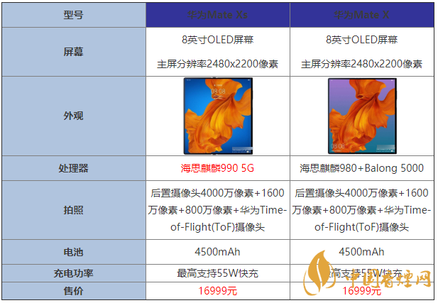 華為Mate Xs:搭載海思麒麟990 5G處理器,華為MateXs處理器升級到麒麟990 5GSoC,CPU、GPU、NPU方面的性能和上一代相比分別提升23%、39%、460%