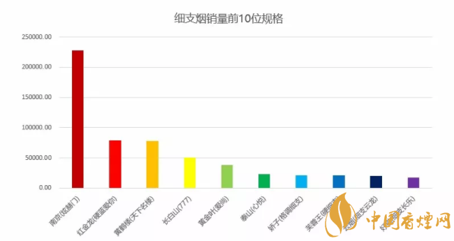 2、如圖所示2018細(xì)支煙排行榜(規(guī)格銷量)圖:在2018第一季度中國(guó)細(xì)煙排行中1-3月細(xì)支煙銷量前10規(guī)格:第一名南京(炫赫門)/第二名紅金龍(硬藍(lán)愛你)/第三名黃鶴樓(天下名樓)/第四名:長(zhǎng)白山(777)/第五名:黃金葉(愛尚)/第六名:泰山(心悅)/第七名:嬌子(格調(diào)細(xì))/第八名:芙蓉王(硬細(xì)支)/第九名:云煙(細(xì)支云龍)/第十名:好貓(細(xì)支長(zhǎng)樂)