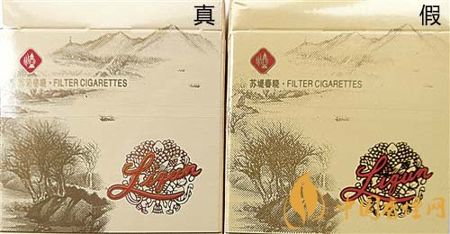 真品商標紙采用膠印印刷,中間“利群”文字及拼音采用壓凸燙金工藝,用手摸凹凸感明顯,“蘇堤春曉”主體圖案顏色較深;假煙采用高清掃描仿制印刷,中間“利群”文字及拼音用手摸無凹凸感,“蘇堤春曉”主體圖案顏色較淡,商標紙整體顏色偏黃。