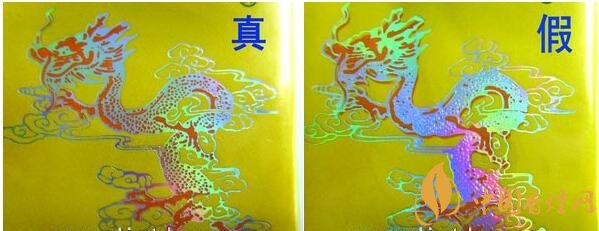 真品小盒正面套印定位燙金“飛龍”圖案鱗片清晰,從頭至尾都能看到定位燙金工藝,紅色貫穿整個(gè)龍身,“鱗片”是雪里透紅,栩栩如生;假煙套印定位燙金仿制較差,鱗片無(wú)法達(dá)到真品的印刷工藝水平,與真品存在明顯差異。