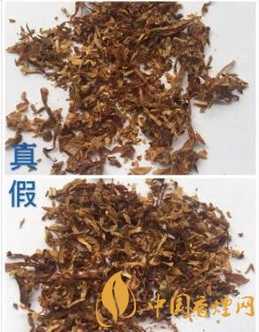 真品卷煙煙絲呈金黃色、絲條狀,內(nèi)含膨脹煙絲,香氣綿柔;假煙煙絲呈棕黑色,含末量大,香精氣味濃烈。