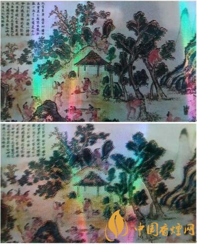 真品卷煙“采香圖”圖案清晰,樹木燙金線明亮。商標紙底紋為點狀,觀察呈現(xiàn)網(wǎng)格狀。該款假冒卷煙“采香圖”圖案模糊,樹木燙金線暗淡,商標紙底紋無網(wǎng)格狀,呈現(xiàn)菱形圖案。