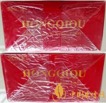 真品卷煙條盒正面“紅旗渠”字體筆畫“起凸”字體高出商標(biāo)紙平面,有立體感,筆畫蒼勁有力,視覺沖擊力強(qiáng)。條盒背面“HONGQIQU”字母與正面印刷相同。