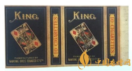 二十世紀(jì)三十年代,南洋兄弟煙草公司出品了“王牌”卷煙。這張煙標(biāo)長(zhǎng)146MM,寬74MM。“王牌”即“KING”,撲克牌“K”牌面。該卷煙標(biāo)正版與副版的圖案一模一樣,煙標(biāo)中央向左傾斜45度的一張方塊“K”撲克牌,其上寫有大大的金色英文字母“KING”,其下為南洋兄弟煙草公司出品的英譯文。整幅煙標(biāo)沒有一個(gè)中文字,左右騎縫處則各印有紅色的“10 CIGARETTES”,即該卷煙規(guī)格為十支裝。方塊“K”牌面,就是凱撒大帝(朱利葉斯·凱撒),為羅馬共和國(guó)終生的執(zhí)政官,后出任高盧總督。四張花色的“K”牌面,南洋公司為何只取其方塊花色呢?因?yàn)樵谒膹埢ㄉ?ldquo;K”中,只有這張方塊“K”為凱撒大帝手持戰(zhàn)斧的側(cè)面像,其余三張人物均為正面像??赡軓S商是為了標(biāo)新立異,從中亦能投射出其生產(chǎn)的卷煙與眾不同吧。如此設(shè)計(jì)的煙標(biāo),握于手掌,更像是拿了一副撲克牌,雌雄難辨,頗有玩味。