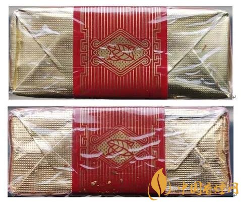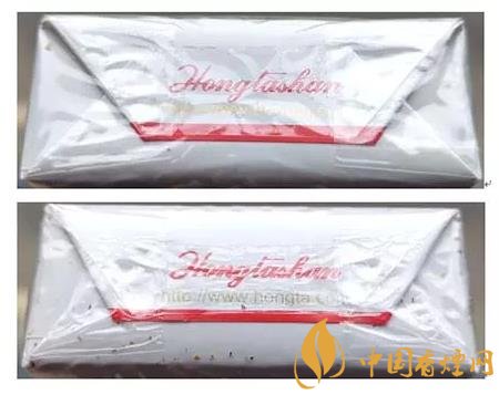 假冒卷煙:1.透明紙燙封收縮雜亂、死板,水汽較重。2.商標(biāo)紙拐角折疊緊實(shí),無空隙。(上真下假)