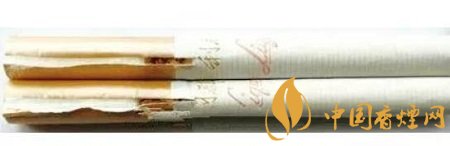 真品商標(biāo)紙采用噴鋁紙凹印印刷,“過(guò)濾嘴香煙”字體筆畫(huà)較粗且粗細(xì)均勻,金黃色警示語(yǔ)分割線較粗且立體感強(qiáng),用手摸凹凸感明顯;假煙采用高清掃描仿制印刷,“過(guò)濾嘴香煙”字體筆畫(huà)明顯較細(xì)且粗細(xì)不均勻,金黃色警示語(yǔ)分割線偏細(xì)且立體感較差,用手摸凹凸感不明顯,與真品特征存在明顯差異。(左真右假)