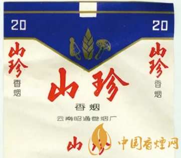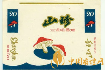 蘑菇是世界上食用菌中最大的一個(gè)菇種,因其富含的人體必需氨基酸、礦物質(zhì)、維生素和多糖等營養(yǎng)成分,而有“植物肉”之稱。上世紀(jì)80年代,云南昭通卷煙廠出品有一枚“山珍”(圖5)煙標(biāo),該標(biāo)主版上方于藍(lán)底上,采用金色分別描繪了兩種蘑菇,以及一根春筍的畫面。