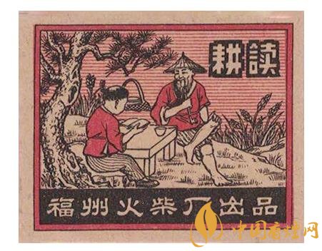 而福州火柴廠出品于1954年的“耕讀”(圖4)火花,則表現(xiàn)了一位頭戴斗笠的老農(nóng)在春耕間隙,翹著二郎腿坐在田邊青松下的石頭上,胳膊肘斜放于在石桌,面帶微笑,抽著旱煙陪伴孫兒讀書的場景。再看老農(nóng)身后的簍子,以及桌上的碗筷,似乎是描寫這個(gè)老農(nóng)在吃完孫子給送的飯后,不忘“耕讀傳家”祖訓(xùn),利用吃飯休息間隙,輔導(dǎo)孫子多學(xué)點(diǎn)知識(shí)。