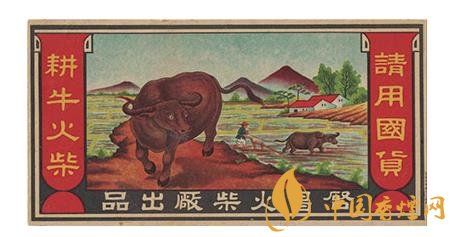 上世紀(jì)30年代,啟昌火柴廠出品的“耕牛”(圖1)火花,就描繪了一幅美麗的山村春耕圖:在數(shù)棵綠油油的樹木點(diǎn)綴下,幾戶農(nóng)家散落分布于山腳前的農(nóng)田里,一位頭戴斗笠的農(nóng)夫正扶犁驅(qū)牛耕田,近處則是一頭碩大的水牛目視前方的形象。