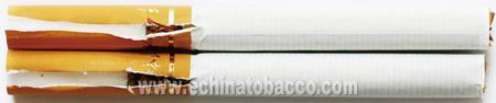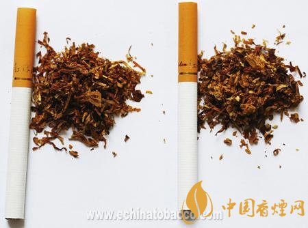 煙支過濾嘴及煙絲差異對比:真煙煙支采用單一醋纖濾嘴,長度為24mm,煙絲切絲寬度均勻,煙絲疏松、光澤油潤性好、呈檸檬黃色,煙絲結(jié)構(gòu)為葉絲、膨脹梗絲和造紙法再造煙葉;假煙煙支過濾嘴較短,長度約為20mm,制絲工藝粗糙,色澤發(fā)暗無光澤、煙絲中含碎末較多,大量梗絲未經(jīng)過膨脹處理,無造紙法再造煙葉,與真品特征存在明顯差異。