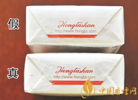 真煙透明紙燙封收縮均勻、自然,有烙鐵痕跡,商標(biāo)紙拐角折疊空隙較大;