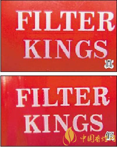 2.小盒側(cè)邊“FILTER KINGS”白色英文字防偽效果對比:用紫外燈照射其3到5秒鐘,真煙照射處的白色字會變成紫紅色,關(guān)掉紫外燈等幾秒鐘后,變色處會恢復(fù)為原先的白色,且白色字體邊緣光滑、表面干凈;假煙的防偽變化效果較差,字體邊緣有毛渣和印刷留下來的污點。