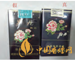 正面商標(biāo)紙差異對比:真品卷煙采用絨面印刷工藝,花形悉心勾勒,更顯質(zhì)感,圖案“牡丹花”更為寫實。假冒偽劣“牡丹(軟藍(lán))”多以舊版“牡丹花”造型進(jìn)行模仿,其圖案與真品存在明顯差異。