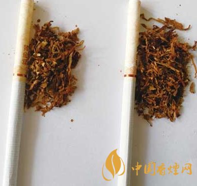 煙支及煙絲差異對比:真煙煙支的水松紙顏色偏黃,煙絲結構為純?nèi)~絲;假煙煙支水松紙顏色偏淡,煙絲結構為葉絲、造紙法再造煙葉,與真品特征存在明顯差異。